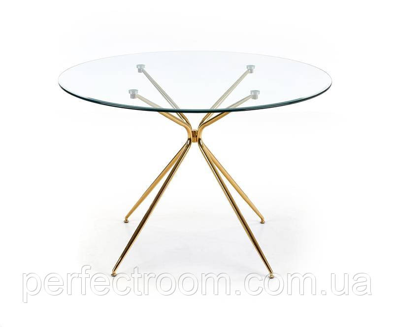 Стіл Halmar Rondo – вишуканий стіл з круглою стільницею з загартованого прозорого скла. Основа столу виконана з хромованої сталі золотого кольору.